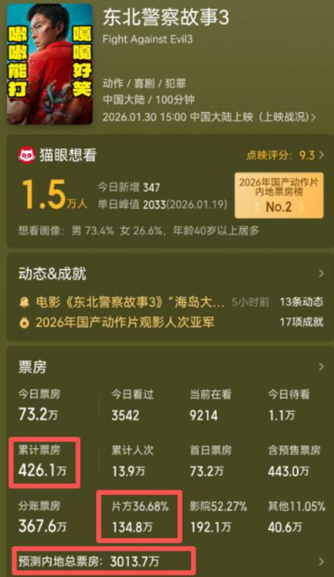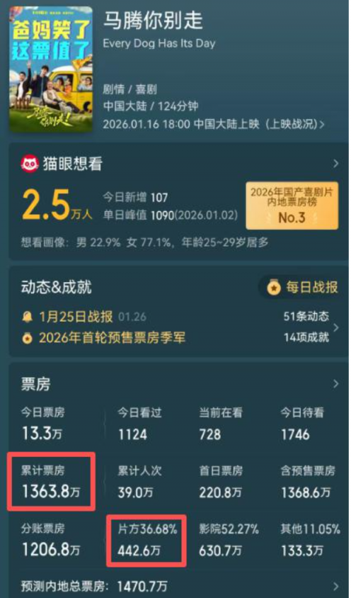 从猫眼平台数据来看,片方甚至才分得一千多万。