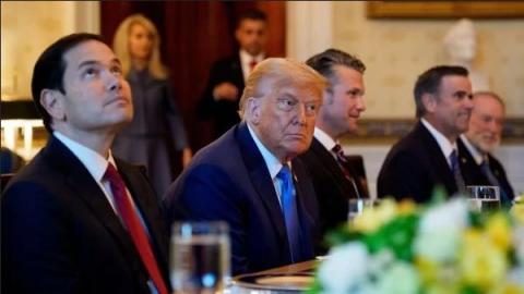 2025年7月7日,(从左到右)国务卿卢比奥、美国总统川普、国防部长赫格塞斯、中央情报局局长拉特克利夫和美国驻以色列大使迈克・赫卡比在白宫蓝厅与以色列总理内塔尼亚胡共进晚餐。