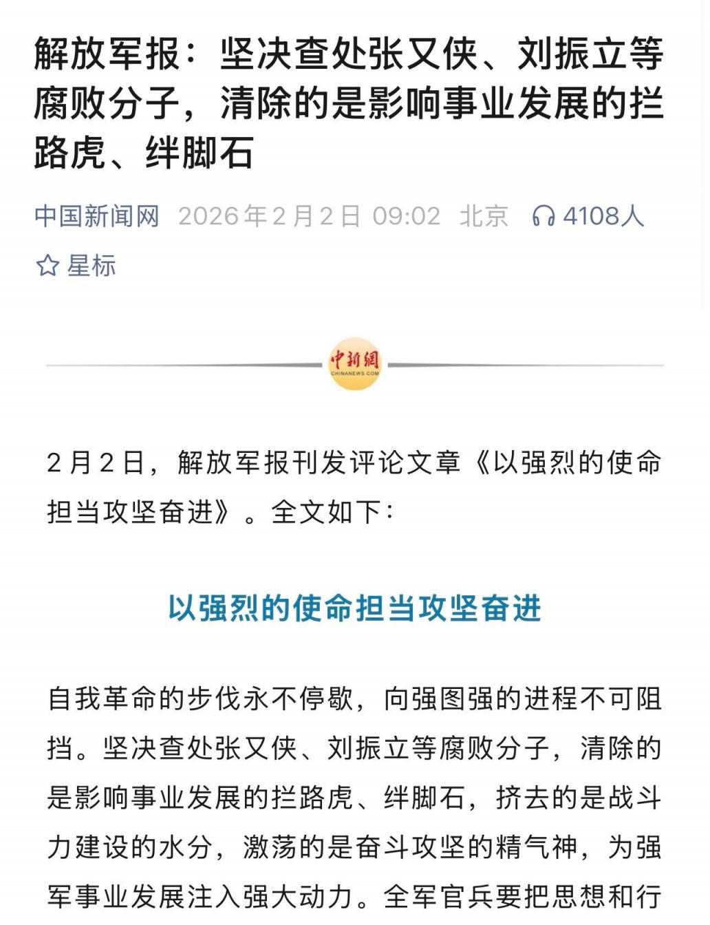 2月2日,解放军报刊发评论文章《以强烈的使命担当攻坚奋进》。
