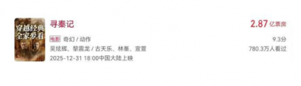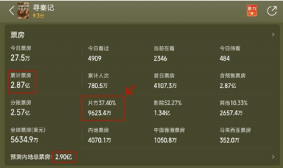 《寻秦记》的总票房 2.87 亿,实际到片方手里的不到一个亿,按照预测内地总票房 2.9 亿来看,最终依旧很难破亿。