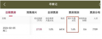 目前就只剩下 1.6% 了,再过不到半个月,恐怕在内地的排片量会掉到 0.1% 以下。