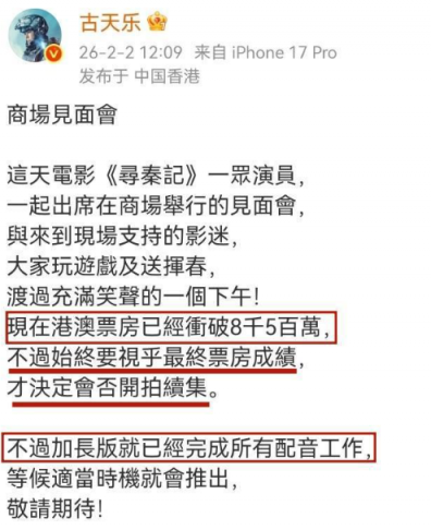 近期则是在中国香港举办了商场见面会,并透露港澳的票房已经冲破了 8500 万。