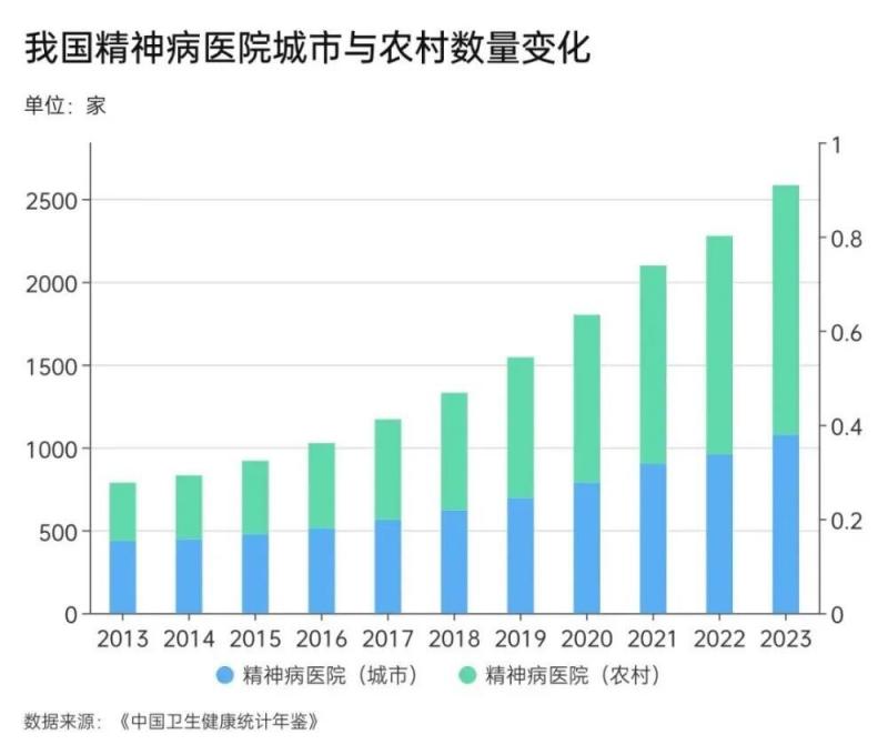 截至2023年,全国精神病医院数量达2583家,而10年前这一数字仅为787家,10年间规模扩大约3.28倍。