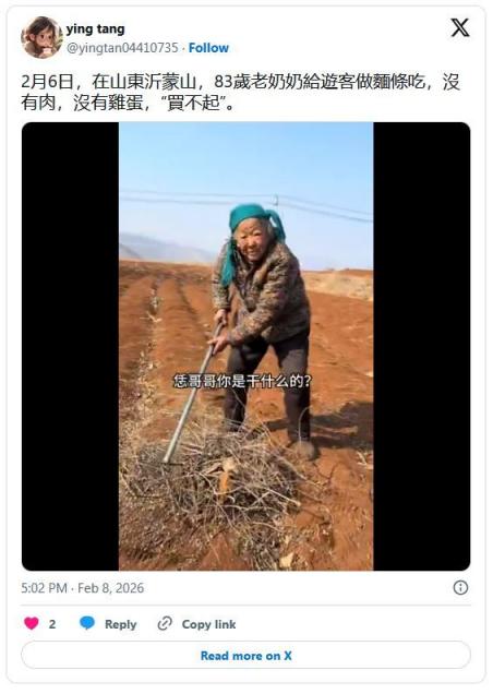 这段视频在X平台也引发热议,不少华人网友表示:“这个给我看哭了,我的祖籍也是山东蒙阴的,是革命老区,唉!想不到他们现在过还是如此⋯⋯”